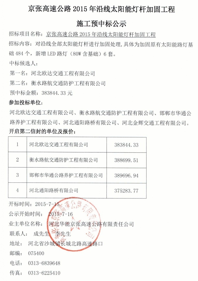 太能能燈桿加固工程施工預中標公示