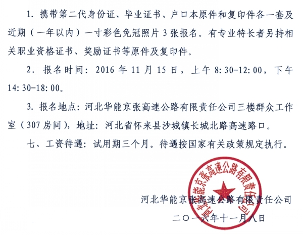 京張高速公司2016年收費人員招聘公告