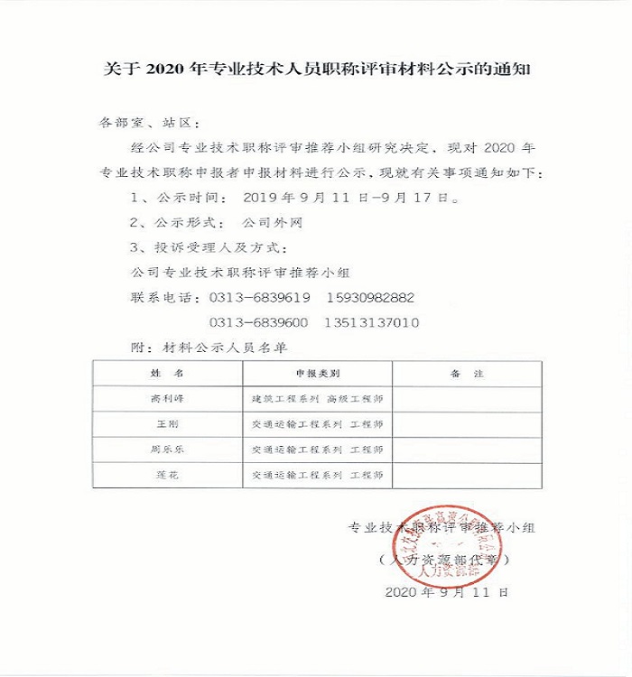 關于2020年專業技術人員職稱評審材料公示的通知
